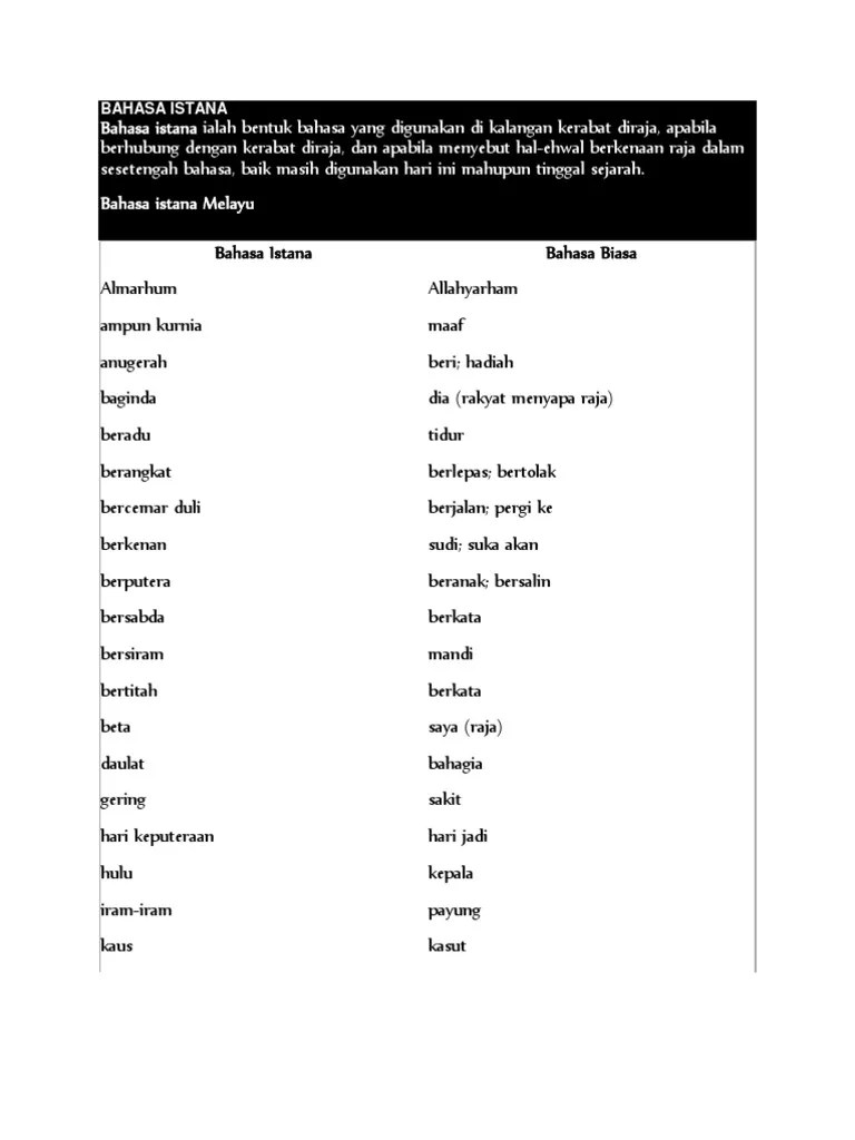 Ungkapan diraja yang digantikan dengan perkataan biasa a) digantikan dengan "menurut . Bil perkataan maksud 1 baginda panggilan . Bahasa istana bahasa biasa murka marah patik saya (rakyat menghadap raja) peraduan tempat tidur. Bahasa istana atau bahasa dalam ialah suatu laras bahasa halus yang digunakan dalam kalangan kerabat diraja sama ada dengan tujuan berhubung atau berbicara .